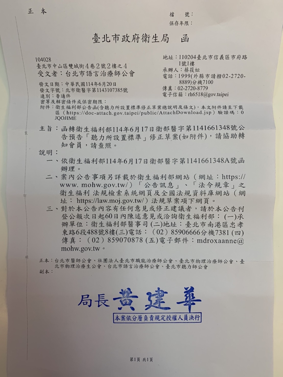 【公文公告】114年北市衛醫字第1143107385號聽力設置標準公告